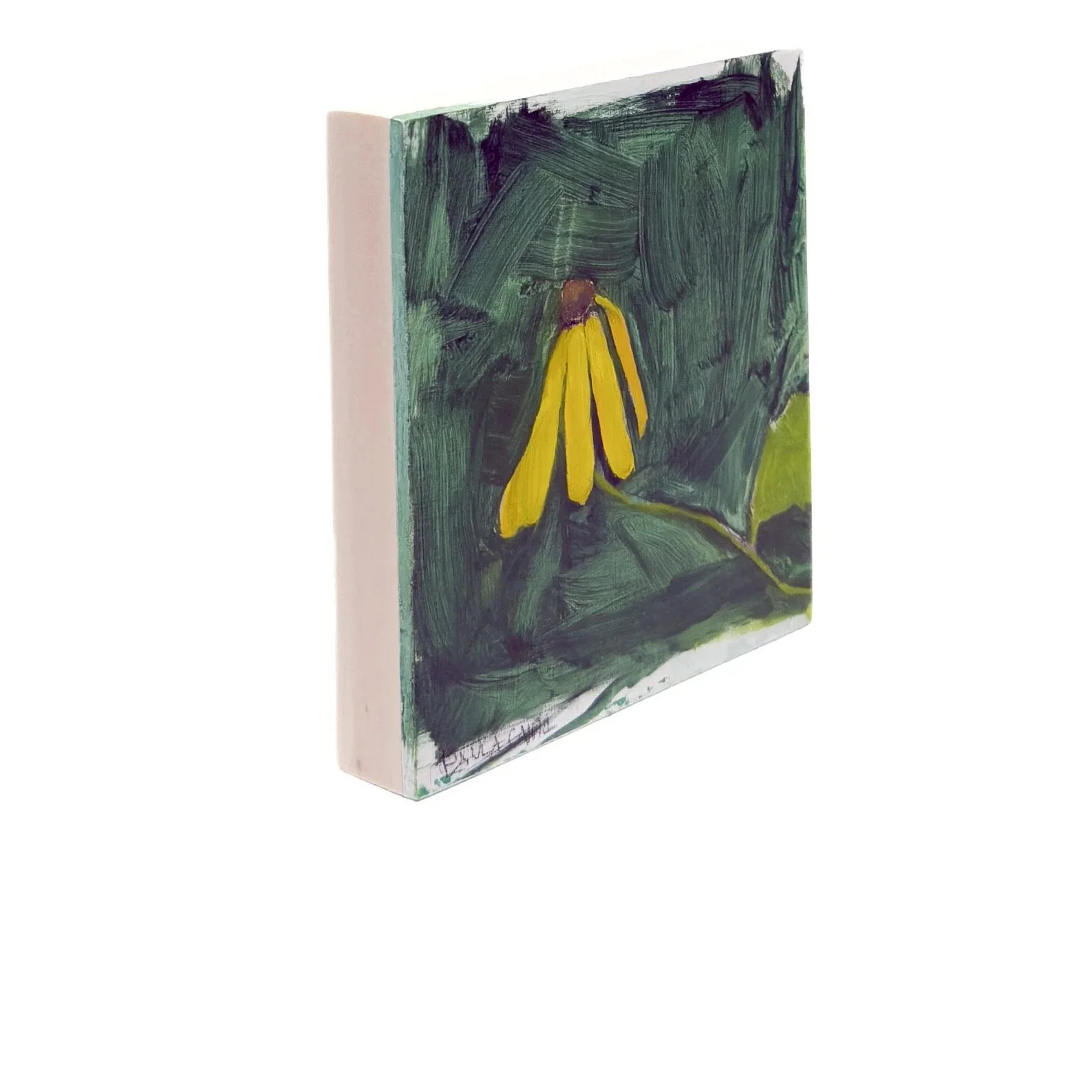 Another Sad Flower shows a single yellow flower set against a solid green background. The petals angle downward from the center, and the surrounding brushwork adds texture and movement to the surface. The simple composition keeps the focus on the flower’s shape and color.